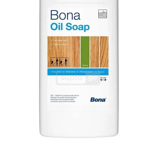 Bona Oil Soap არის საპონიფიცირებული მცენარეული ზეთისგან დამზადებული საწმენდი საშუალება, იგი შექმნიალი სპეციალურად ზეთოვანი ხის იატაკის რეგულარული გაწმენდისა და მოვლისთვის. ეფექტურად ასუფთავებს და კვებავს ზედაპირს, ასევე ტოვებს უხილავ დამცავ ფენას, რომელიც მატებს იატაკს ბზინარებას.